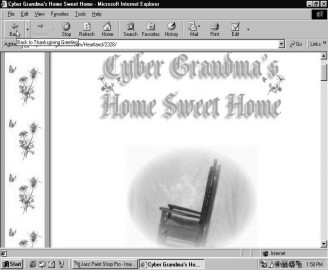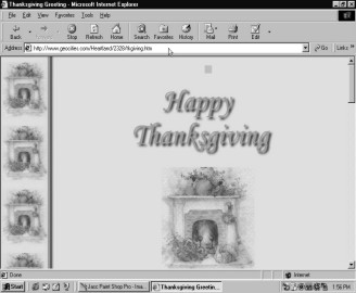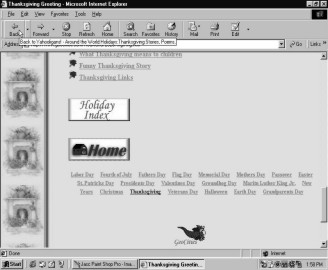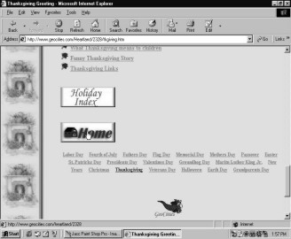 Thanksgiving on the Farm is on the site `geocities`. A quick glance at the status bar, which stretches at the bottom of your screen, will confirm this observation. Geocities offers you further links on Thanksgiving. By clicking on `Home` you will be taken to the first page which contains stories by cyber grandma.