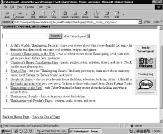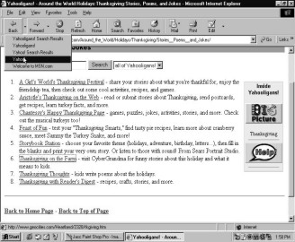 One more click on the `Back` button will transport you to the Thanksgiving Greetings page. Another click will take you to the Yahooligans! site. Instead of continuously clicking on the `Back` button to take you to the Yahoo! site, click on the dropdown arrow next to this button. It will give you a list of all the sites you have visited. Simply choose Yahoo! from there and you will instantaneously be transferred to the Yahoo! website. Now you are all set to conduct a new search.