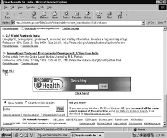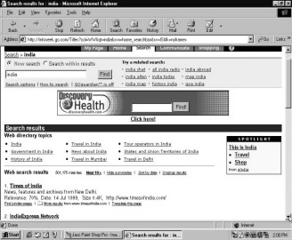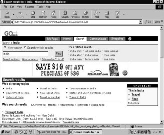 Type in the address of another search engine in the address bar. Punch in www.infoseek.go.com and let us see the results that this search can output on India. You will notice that the Infoseek website greatly differs from that of Yahoo! Each site has its own style and its own appearance. This is because every website wants to be distinct and unique. They don’t even want to be asscoiated with the expression 'like two peas in a pod'. So every site aims at making their pages more attractive and more user friendly than the other. Type in 'india' in the search bar and click on the `Find` button to obtain the results.