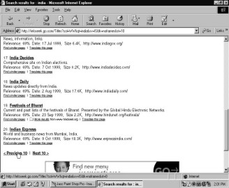 Infoseek gives you a web directory of topics that it has personally visited on India. These cyber chef’s recommendations include travel, news and history on the land of snake charmers and elephants. Besides these handful of directory topics, it also gives you further links on our country. Scroll down the page and to view the next ten links, click on the hand.