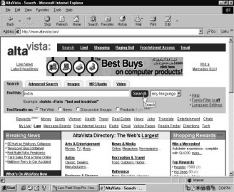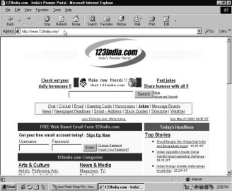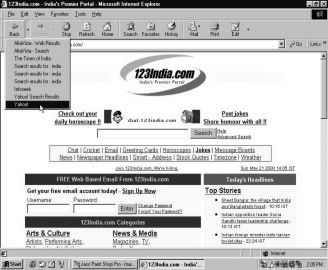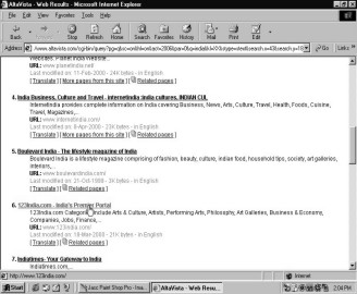 Let us check out the functioning of another search engine. Type in www.altavista.com in the address bar. Type in 'india' in the search bar and click on the `Search` button. Altavista will conjure up its very own search result. Each search engine is like a chef, whipping up his own speciality, his own recommendations. Altavista gives you links of other Indian websites like www.indiatimes.com and www.123india.com that have their own search locomotive. Let us make a quick trip to the www.123india.com site.