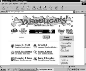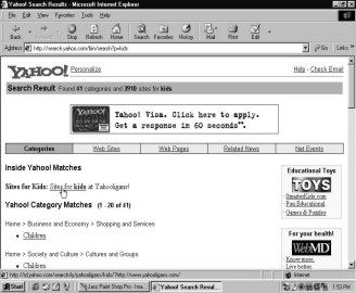 There are a vast number of search engines that classify the information for us. One such engine is `Yahoo!`. And no, this 'yahoo' has nothing to do with the junglee Shammi Kapoor, although these days the Internet and his name seem almost synonymous! To visit the site all you need to do is simply type in 'yahoo' in the address bar. The computer automatically converts it into its full address format of http:// www.yahoo.com. Or then if you aren’t feeling so lazy, you may enter www.yahoo.com yourself.You are welcomed by the attractive Yahoo! website. The first page of the website gives you a sneak preview of all that the site has to offer. In order to find something, all you need to do is simply type in what you are searching for. Here we have typed in 'kids'. You may search for whatever information you want, from the mating of the koala bears to the footprints of the Abominable Snowman, anything under the sun, moon, stars, satellites, spaceships and dish antennae. Once you have entered what you want Yahoo! to search for, click on the `Search` button. This will submit your search to the site and allow it to find the related information for you.