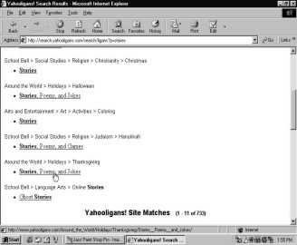 Yahooligans! comes up with a plethora of 733 story site matches. You can choose from among the various sites it offers, like stories on Christianity, Hallowe’en, languages etc. Let’s select the tales on Thanksgiving. After all, kids need to be taught the importance of gratitude.
