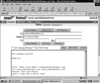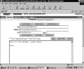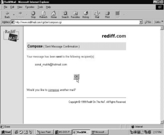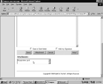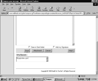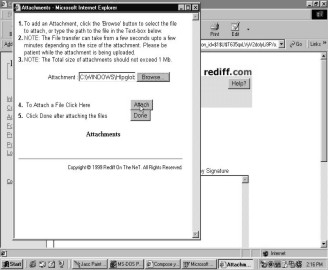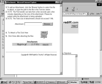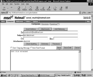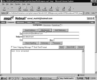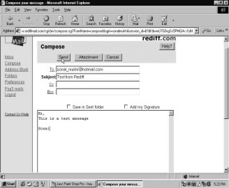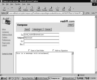On your compose screen, you will see the words 'Attachments: attach.txt'. This is to ensure you that your file, attach.txt, has been tagged to your message. Click on the `Send` button to zip this file across to your Rediff account.