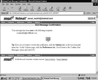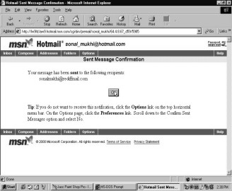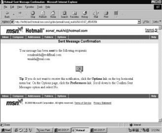 As usual, Hotmail plays it safe by letting you know that your message has been instantaneously delivered to the desired recipient. Press the `OK` button and then sign out from Hotmail.