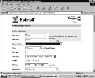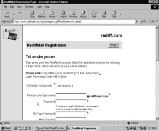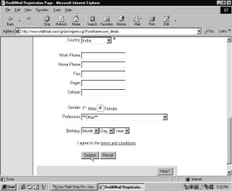 Similar to the Hotmail registration form, Rediff also asks you to supply them with information about yourself. The only difference between the two forms is that Hotmail obliged you to answer all their questions, whereas in this form you can omit responding to those questions that are not indicated with an asterisk. Once you have filled in the required details, click on the `Submit` button. Once again the hint question and answer will come to your rescue incase you forget your password.