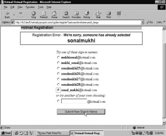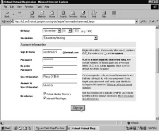 Account Information relates to your log-in name and your secret password. The name that you enter in `Sign-in Name` will be the first part of your email address. Type and retype your secret password. The secret question and answer will bail you out in case you forget your password. If you want to be a part of the Hotmail Directories, tick the check boxes at the bottom of the page. When you have supplied all the required information, click on the `Sign Up` button and wait for Hotmail to respond. The early bird catches the worm. If somebody else has already taken the log-in name you asked for, then you will have to select another. There may be one hundred Hetal Shah’s or Rohit Patel’s in this world. Judging by the ever increasing population around the globe, even a hundred mark figure may be an under-estimation! But for Hotmail, no two people can have the same sign-in name. So it presents you with a list of relatively similar options according to the one you had asked for. The options may have either some digit or underscore character attached to them. You can choose any of the suggested options or then you can type in one of your own. Click on the `Submit New Sign-in Name` button.
