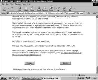 Hotmail will then present you with a long page of terms of service. Like how everything mom says comes in from one ear and goes out just as quickly from the other, similarly this form needs to be blindly accepted. More than a three second glance at this page will be a waste of time.