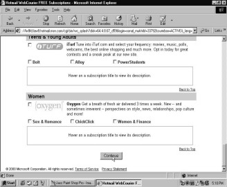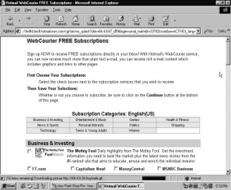 Hotmail offers you free subscriptions on various topics. You can select any subject that interests you and receive free web couriers on it. It is important to know that every email service provides you with only a ceratin amount of space. Hotmail allows you to 2000KB of free space. Incase your account size overshoots this limit, then the Hotmail staff will send you a warning message, threatening to erase your mails if you don’t get rid of them yourself! So be careful to delete all junk mails as soon as you receive them, before they burden your inbox. Thus if you don’t want your Hotmail inbox to be flooded with all these couriers ignore this service and click on the `Continue` button.