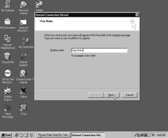 The dialog box that appears asks you to type in your name. The name that you type in will be the one that will appear with all the emails you send. Here we are inputting `Vijay Mukhi`. But make sure that you enter your own name in this address bar. After entering your name, click on the `Next` button to move to the subsequent box.