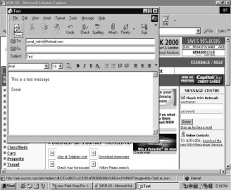 A new dialog box will appear. Type in your newly created Hotmail address in the `To` address bar. You can also give a subject to your message. As we are testing the functioning of our accounts, let us title the message as 'test'. Type in whatever message you want to send yourself. Maybe the recipe of what you feed your pet cat for dinner or your grandma’s medical prescription or then a simple line to say that this is a test message. After you have typed in the message click on the `Send` button. Your message will be flown across to your Hotmail account.