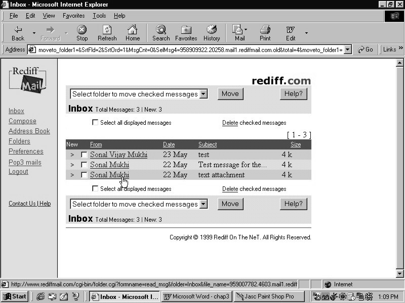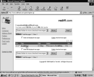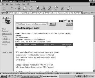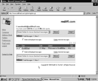 The first message in your inbox is the welcome greeting from the Rediffmail staff.