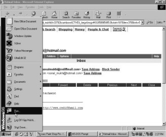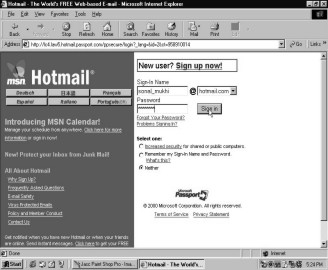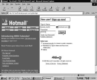 Let us make an account in Hotmail. No, that does not necessarily mean that your mails will be sizzling hot with gossip and scandals. But the name may have something to do with the 'Hot Male', Sabeer Bhatia, who is the creative brain behind this ingenious service. Well, the biggest advantage of having an account with Hotmail or Yahoo! is that you can access it anywhere in the world. Even if you are atop the highest mountain peak in the Tundra region or swimming underwater with the penguins in Antarctica, you can still read your mails, so long as you are able to lay your hands on a computer with an Internet connection! This is because Yahoo! and Hotmail provide web based email services. This is not the same for a VSNL, MTNL or any other ISP account which may or may not be accessible from all places on the globe. Make sure that you are connected to the Internet and then type in www.hotmail.com in the address bar and press `Enter`.
