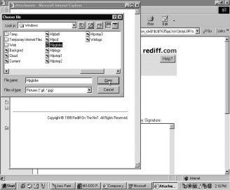An `Attachments` dialog box appears. To adjoin the desired file, click on the `Browse` button. From the new box that appears you can select the file you want to attach. You may attach any file saved on your hard disk. It maybe a picture file with snapshots of your graduation day, a photograph of your pet cat’s pet mouse or then your milk man’s portfolio. It may also be a text file with your thesis on why 'mom’s are from Mars and dad’s are from Venus' or then some random jotting of your observations during a journey in the 10.37 Virar local. Click on the name of the file you want to attach and click on `Open`. The name of the file will appear in the `File name` column.