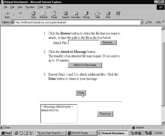 Once the attachment bar displays that the file has been successfully attached, click on the `Done` button. You will then return to the Compose message screen which will show the name of the file that is attached. Click on the `Send` button to dispatch your hipglobe.gif file.