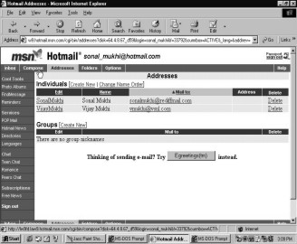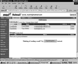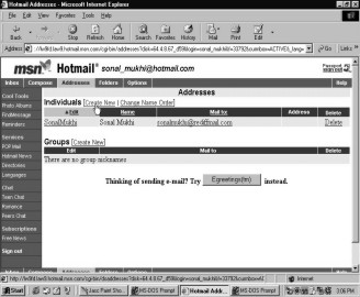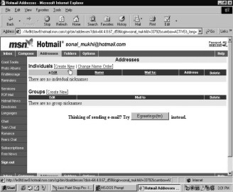 After you have logged on to your Hotmail account, click on the `Addresses` option. You can store either individual addresses or then group ones. To make an address book with individual email addresses click on the `Create New` option.