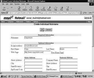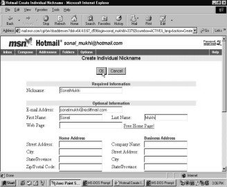 The `Create Individual Nickname` dialog box will open. Enter the nickname, the email address, the first and last name of your friend in the space provided. The nick name need not necessarily be the real name of the person. You can enter any small pet name like rinky, chinky, minu, sonu, etc. Once you have supplied the required information, click on the `OK` button.