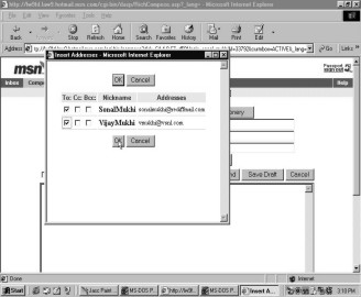 To input the email addresses of those who you want to mail, choose the `Insert Address` button. A dialog box containing the names and addresses of those you have stored will be displayed. If you want to send the message to both the people in the list, tick the check boxes next to their names.
