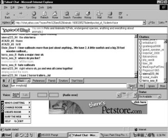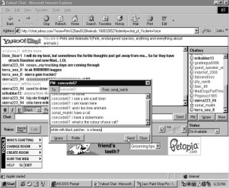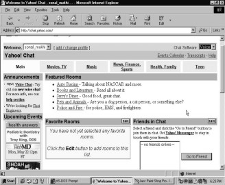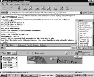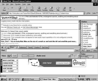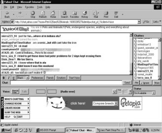 Yahoo! Chat has a menu of chat rooms from which you can choose. You can visit the chat room according to the subject that pleases you. Are you a racing fan? A book worm? Or then a cat freak? Yahoo! Chat has chat rooms especially designed for your likes.