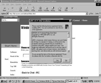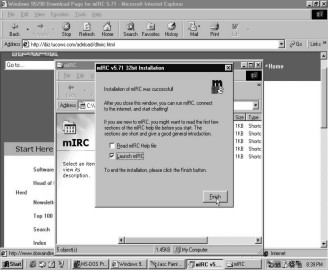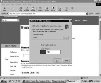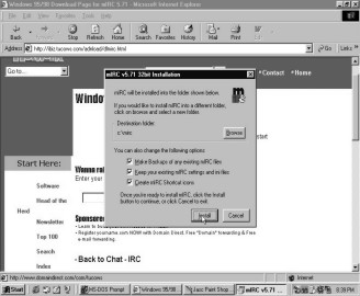'Better to be safe than sorry' is the motto I live by. So does the computer. It gives you the option of creating a back-up file of the MIRC program you have downloaded. Grab this option, like you would do for any 'buy one soap, take the other free' publicity stunt. If you want to make a short cut icon of MIRC on the desktop, tick that option too. Un, dos, tres, ready to install? Well what are you waiting for?! Simply click on the `Install` button and start the process.