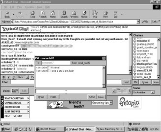 The chat screen appears. In the right window you have a list of all the current chatters who are logged on to this chat room. You have everybody in here, right from a Pegasus to an Indychef , from a Maddogs Parttime to an Italoandross. Even nursery rhyme heroine Jilly_vanilli is on the chat module. Me thinks she has switched professions from fetching pails of water to licking waffle coned vanilla ice creams. And of course, she has given up following chocolate boy Jack uphill! The central elongated window displays the chat in progress among the various animal lovers from around the world. Join in their cyber conversation and chat by typing in the chat box.