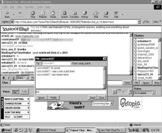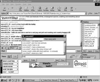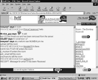 To send a common message to everybody, all you need to do is type it in the bottom blank bar and click on the `Send` button. But frankly even Einstein would have to rack his brains to put together the jigsaw pieces of the conversation that goes underway in the chat rooms. Beach_boy_in wants to guide Archie_5 on the best ways to get a tan, while Archie dearest is busy trying to woo Biblo, who in turn wants the mango souffle recipe from ansha16. So before all sanity is lost, let’s just say our au revoir and exit from the topsy turvy world of chat!!