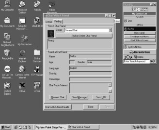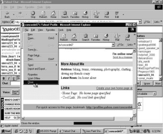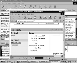 Curious to who know who this fighter plane is? Well just click on the `Profile` button. The details of your fellow chatter (if entered by him) will be displayed in this new window. This will help you to unmask the person behind the nick name. You can get to know his age, sex, hobbies and even take a peek at his photo. To close this window, select the `Close` option from the File menu.