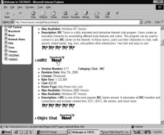 Tucows has found 20 titles for you under IRC. Each IRC title gives you information about the software i.e. its version number, its revision date and its byte size. From these details you can select the software which is best suited for your use. Let us download mIRC, whose version number is 5.71 and has been last updated on May 7th 2000. Click on the `Download Now` button.