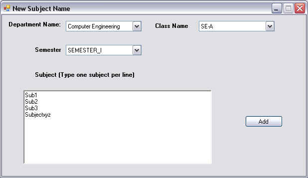 To add new subjects we click the “Subject” menu & click on the “New Subject Name”. Next, you can see “New Subject Name” form in which you have to select Department Name, Class Name and Semester, and then enter the Subjects to be added, each on a new line. Finally click “Add” to add the new subject(s). As shown in Figure 4.2