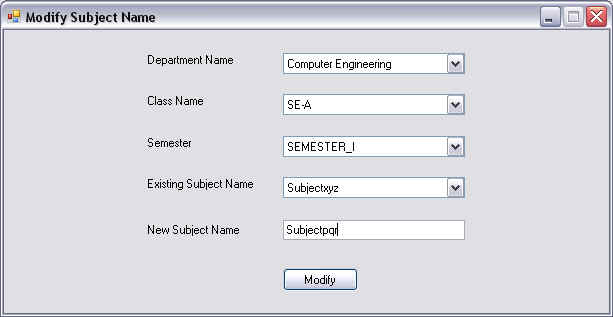 Similarly, to modify a subject, click on the “Modify Subject Name” in the “Subject” menu as shown in Figure 4.1. Further to modify the subject name we select Department Name, Class Name, Semester, Existing Subject Name and type in the New Subject Name & click “Modify” as shown in Figure 4.3