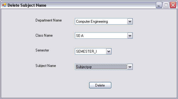 If you require deleting a subject from the existing subjects then click “Delete Subject Name” from the “Subject” menu as shown in Figure 4.1. Then a “Delete Subject Name” form is displayed. Here we select the Department Name, Class Name, Semester, Subject Name and click the “Delete”, as shown in Figure 4.4.