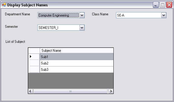 Finally to display list of subject in a particular department, we click “Display Subject Names” from the “Subject” menu as shown in Figure 4.1. The “Display Subject Names” form is displayed on the screen. Here we select the Department Name, Class Name & the Semester and the list of all the subjects is displayed as automatically, shown in Figure 4.5